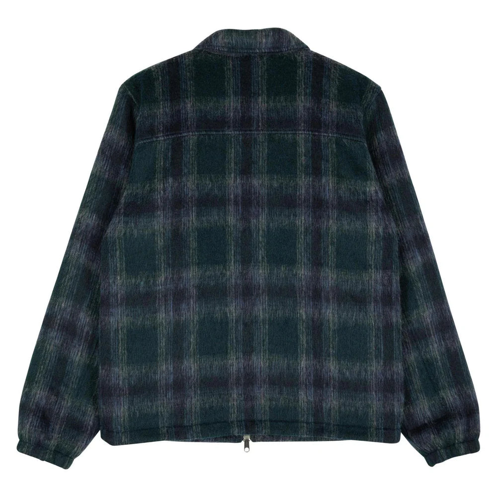 Custom, brushed plaid, jacket with zipper center front closure, welt pockets, and custom woven label at bottom, left.